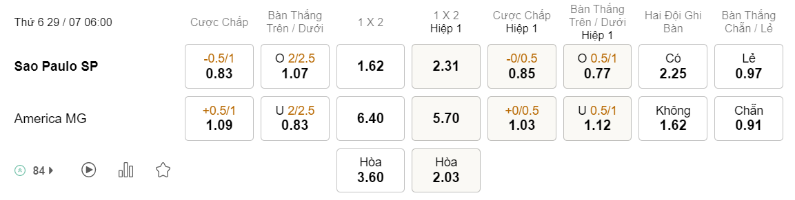 Tỉ lệ kèo Sao Paulo vs America Mineiro