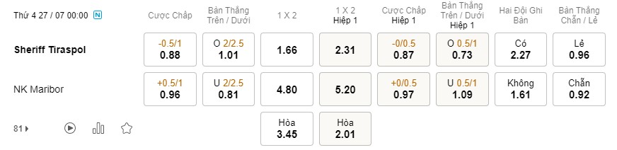 Tỉ lệ kèo Sheriff vs Maribor